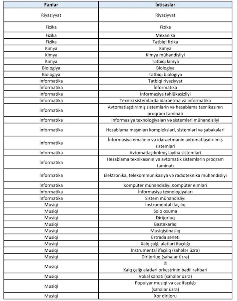 Qeyd edək ki, hər il müsabiqəyə buraxılacaq ixtisasların siyahısı “Pedaqoji fəaliyyətlə məşğul olma Qaydası”nın əlavəsində qeyd edilən ixtisaslara müvafiq olaraq müəyyənləşdirilir.