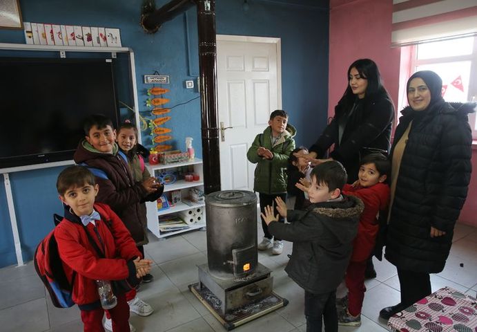 Türkiyədə müəllimlər qarlı havada şagirdləri üçün odun doğrayır