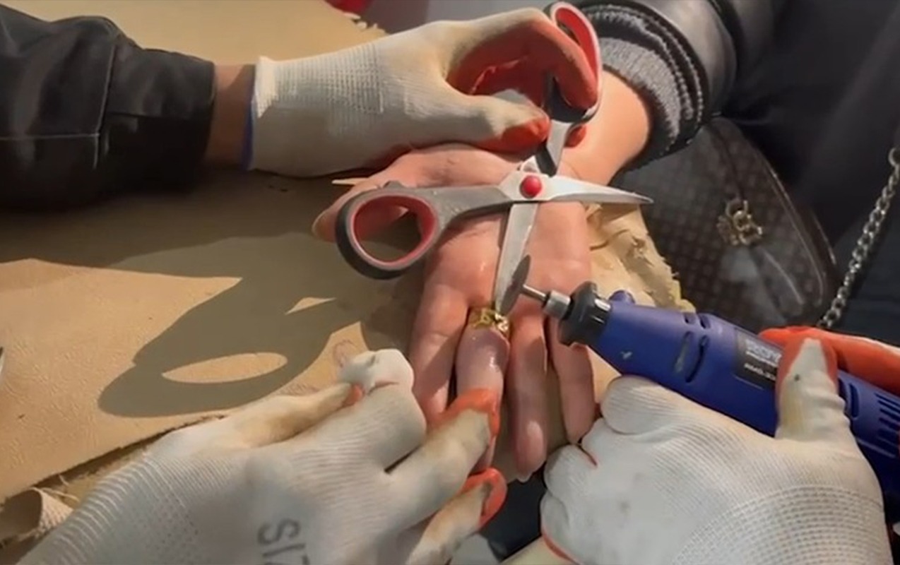 Barmağında sıxışan üzüyü belə çıxardılar - VİDEO