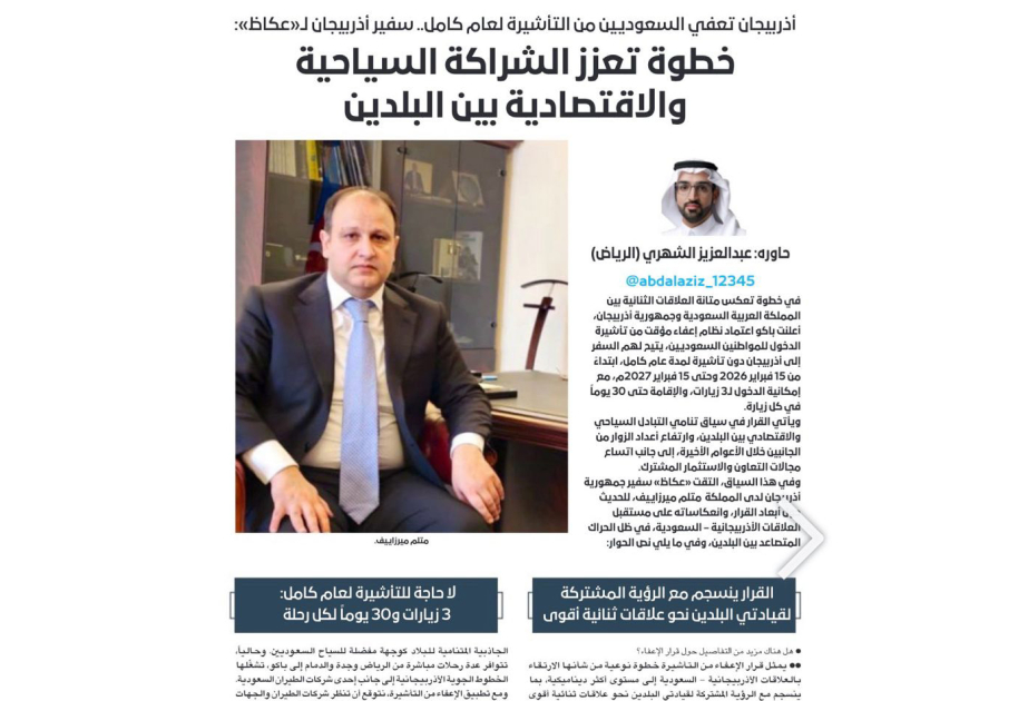 Səudiyyə qəzeti: Azərbaycana vizasız səfər işgüzar və turizm əlaqələrini daha da genişləndirəcək