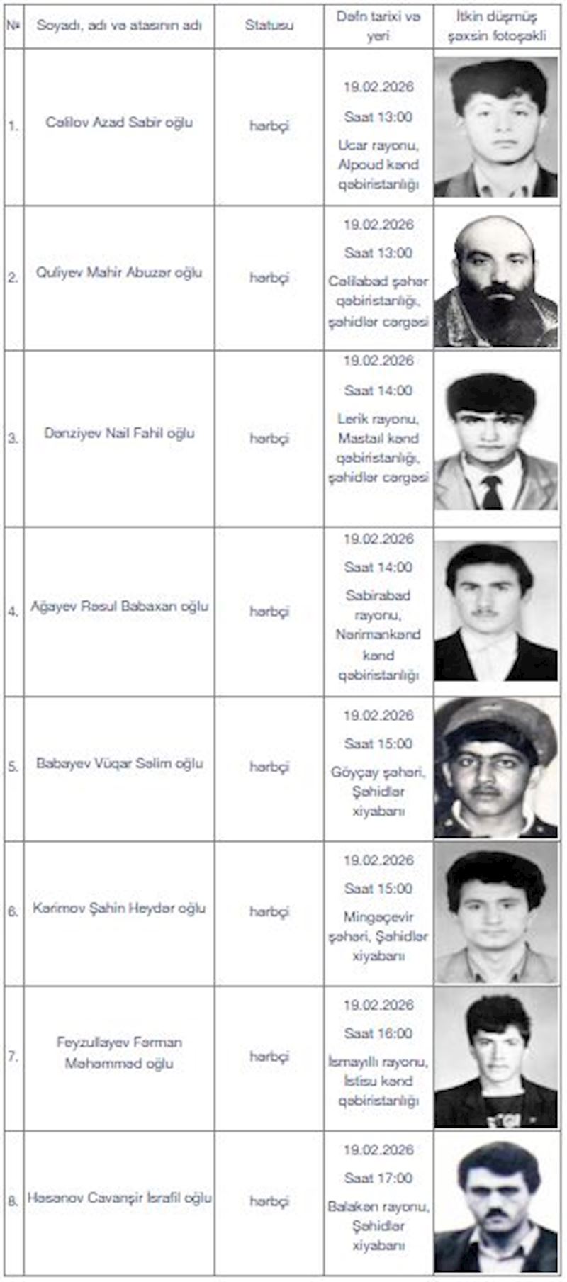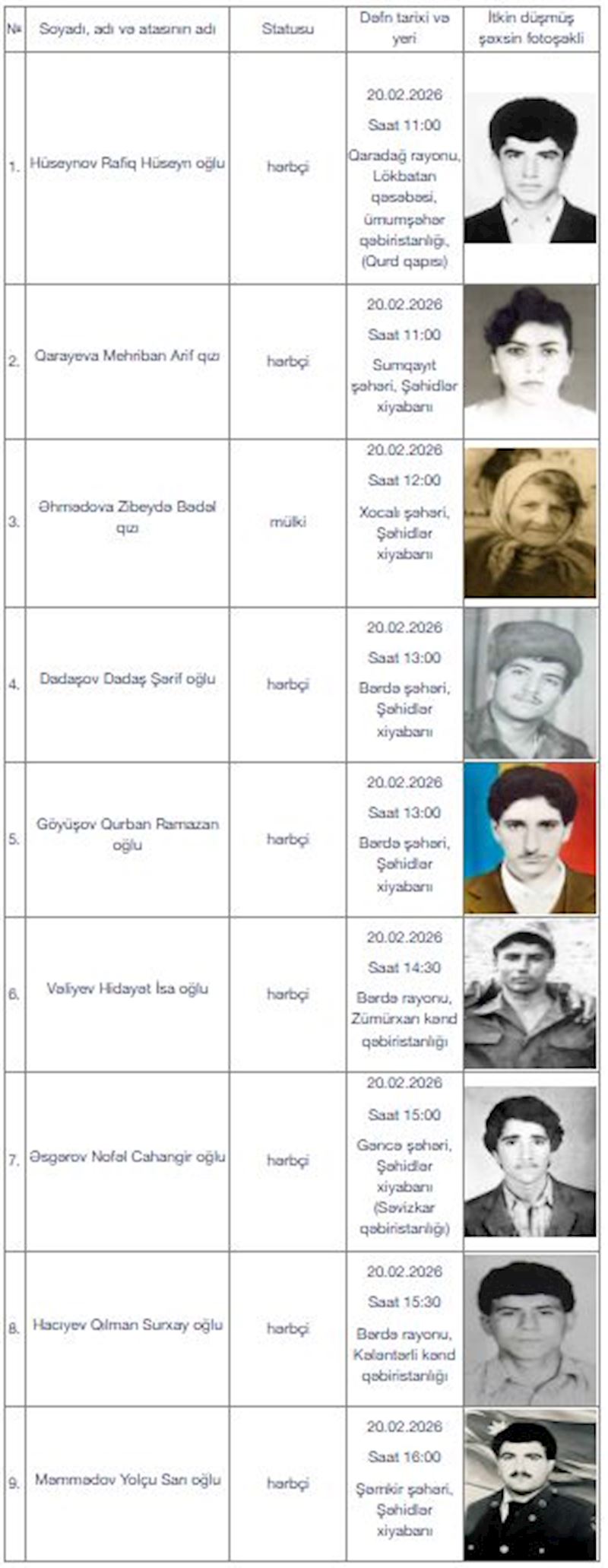 Yeniavaz.com xəbər verir ki, bu barədə Əsir və itkin düşmüş, girov götürülmüş vətəndaşlarla əlaqədar Dövlət Komissiyasının itkin-şəhidlərin dəfn mərasimlərinə dair məlumatında bildirilib.